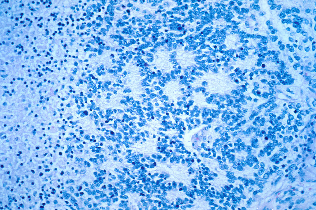 Shown is a microscopic view of a typical neuroblastoma with rosette formation. Magnified x40. Source: Dr. Maria Tsokos, National Cancer Institute – Wikipedia.