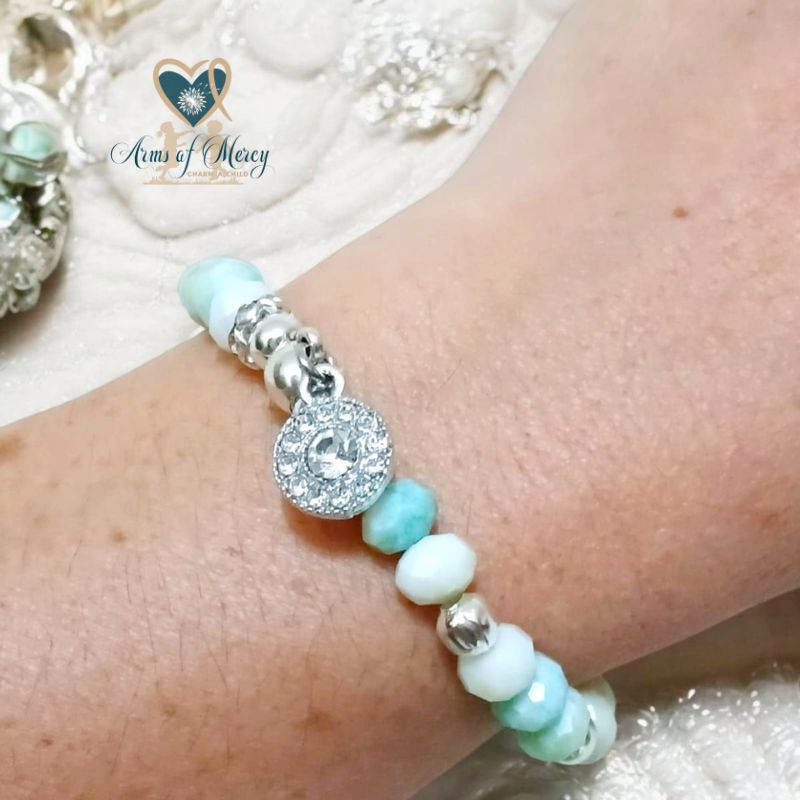 Bracelet care: The bracelet is elastic and can stretch a little bit, please handle with care by rolling it on and off. Charm and silver fillers are not sterling silver. It is best practice to avoid water, and to remove the bracelet before swimming, doing dishes, taking a bath or a shower.